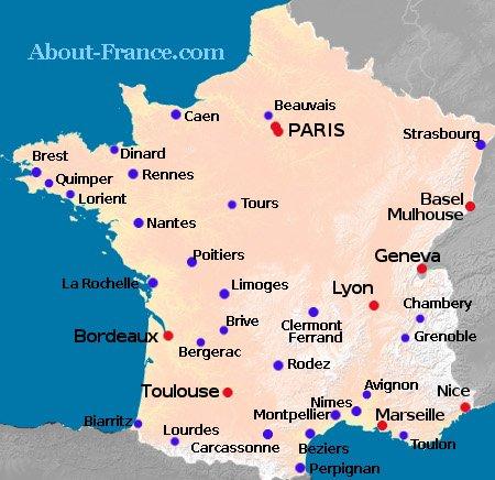 الفرنسيون المقيمين الكتاب مثل الآخرين، والإجازات إلى مدينة الحب (باريس) والساحل الجميل (كوت دازور) كما ذكر في المطارات في خريطة فرنسا. يقع العديد من المطارات الفرنسية بالقرب من البحر الأبيض المتوسط. ومع ذلك، تقع أكبر المطارات حول باريس. مطار شارل ديغول في باريس ومطار باريس أورلي هما أكثر المطارات ازدحاما في فرنسا. ومع ذلك، أصبحت المطارات الأخرى في فرنسا أيضا أكثر وأكثر شعبية من قبل ارتفاع شركات الطيران منخفضة التكلفة.